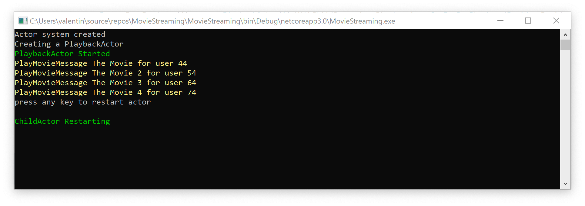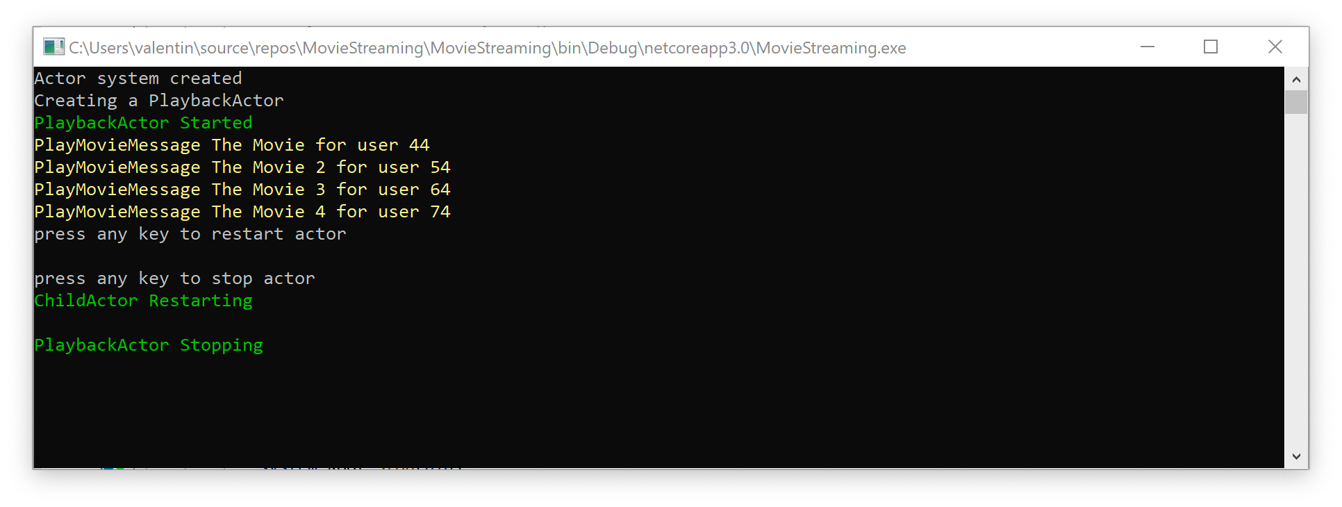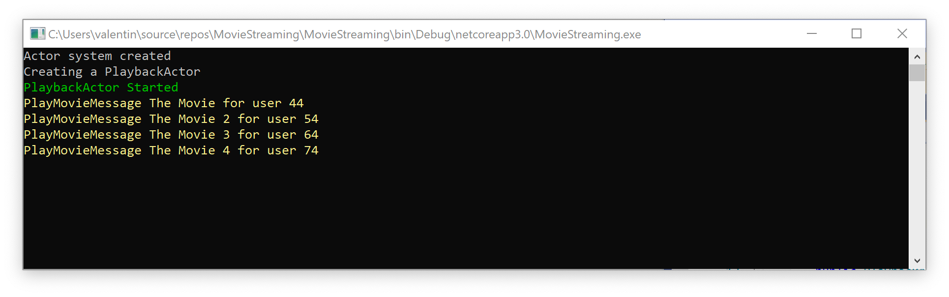 As you can see, the actor system created an instance of the actor PlaybackActor and sent it a Started message. Also, keep in mind that the system message Started will always be processed first. This means if you need to initialize your actor before starting the processing of custom messages. This code should be changed to the Started message handler.