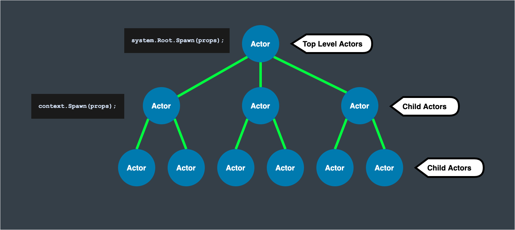 Proto.Actor implements a specific form called “parental supervision”. Actors can only be created by other actors—where the top-level actor is provided by the library—and each created actor is supervised by its parent. This restriction makes the formation of actor supervision hierarchies implicit and encourages sound design decisions. It should be noted that this also guarantees that actors cannot be orphaned or attached to supervisors from the outside, which might otherwise catch them unawares. In addition, this yields a natural and clean shutdown procedure for (sub-trees of) actor applications.
